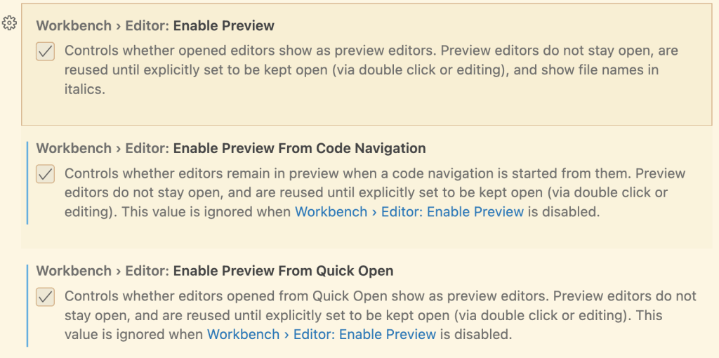 "workbench.editor.enablePreviewFromQuickOpen": true, "workbench.editor.enablePreviewFromCodeNavigation": true